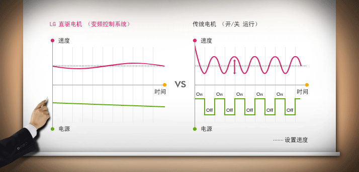 LG變頻直驅(qū)電機(jī)的好處 統(tǒng)一旋轉(zhuǎn)和重量中心:電機(jī)直接作用于滾桶中心 - 增加穩(wěn)定性,震動(dòng)最小化 - 減少噪音-無(wú)皮帶摩擦噪音 減少機(jī)器零件數(shù)量-皮帶和皮帶輪被去除 - 增加耐用性-不磨損