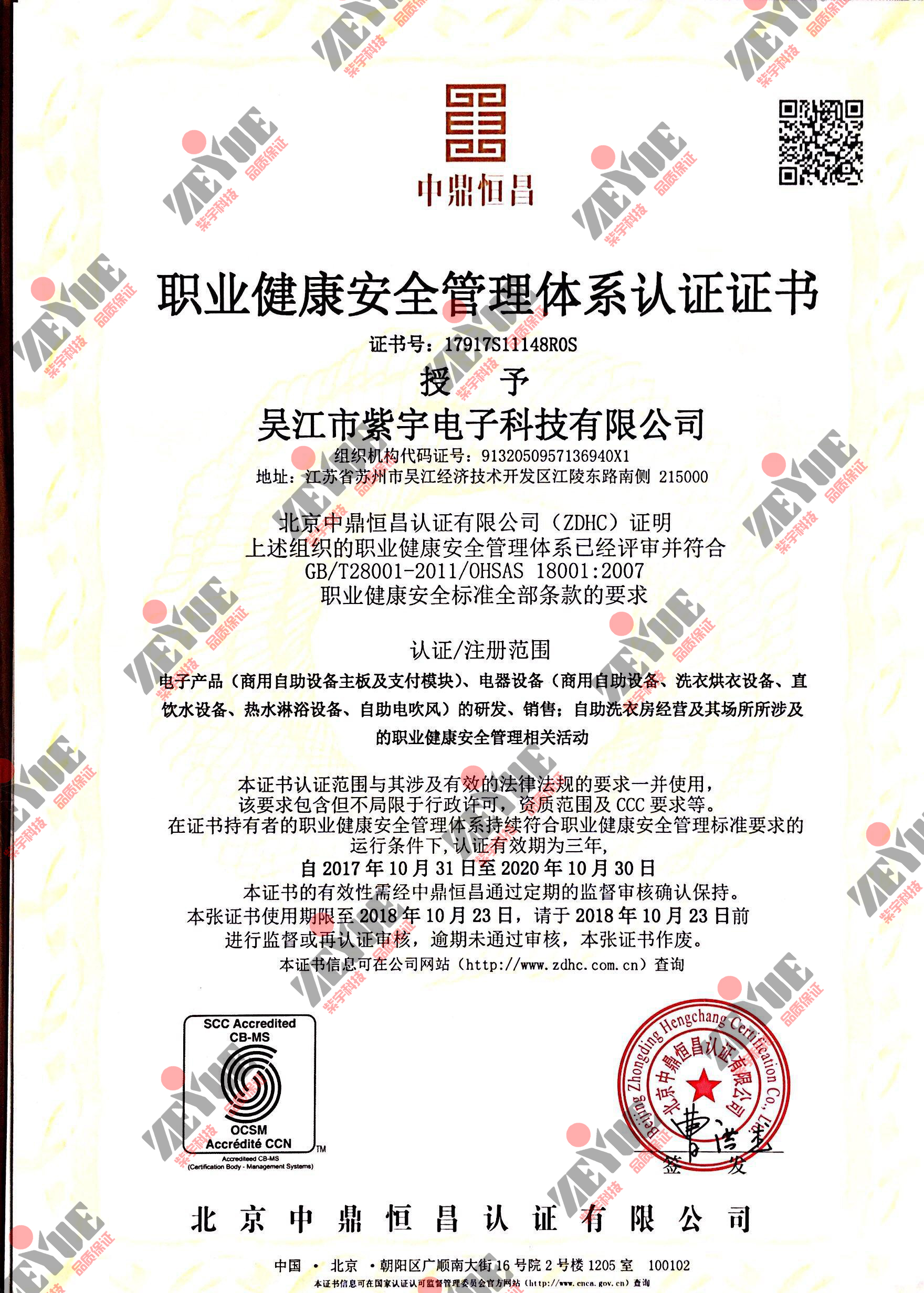 職業健康安全管理體系認證證書